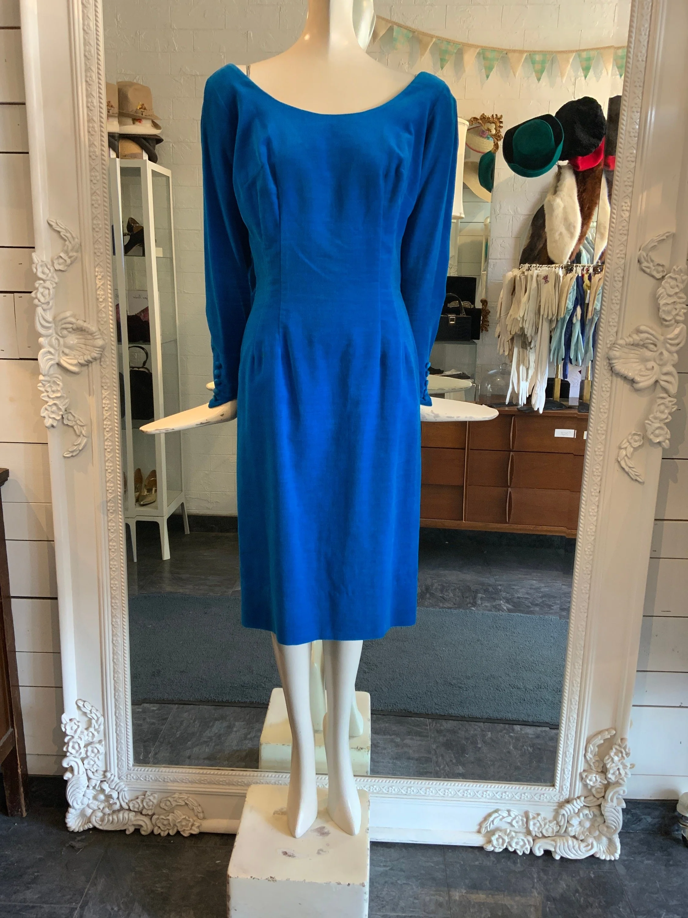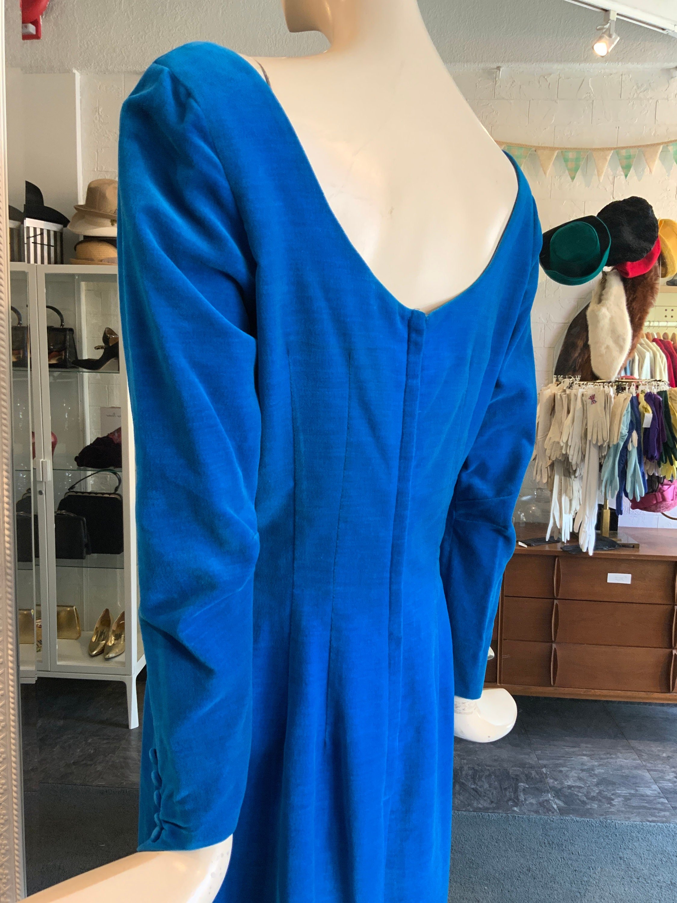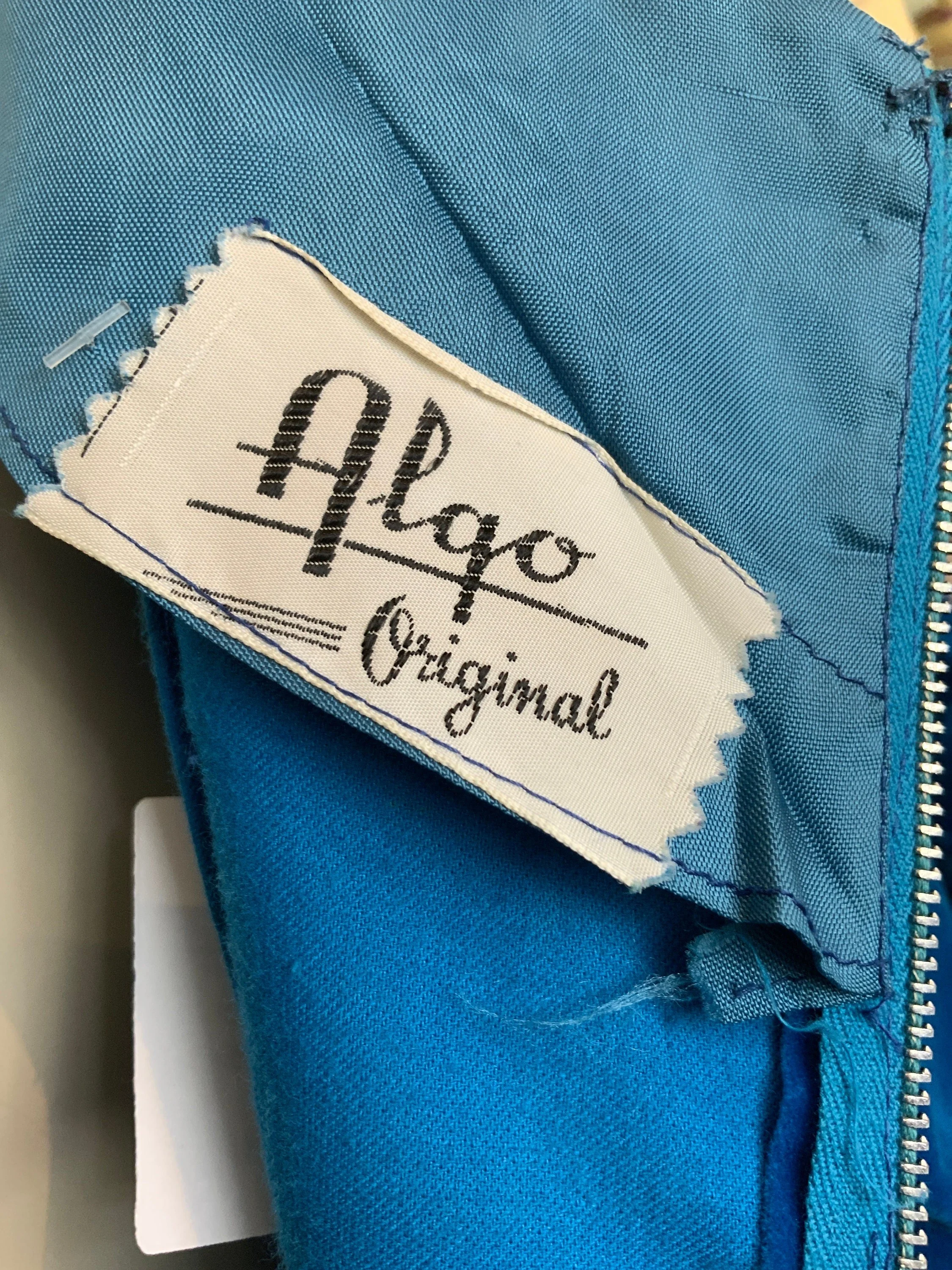 1960s blue and green floral cocktail dress. This has such a pretty pattern that features oversized flowers. It is a shift dress and comes with a thin fabric belt; you can wear it with or without the belt depending on your preference. The neckline shows off your shoulders and is very demure. We love the bow over the left shoulder!
