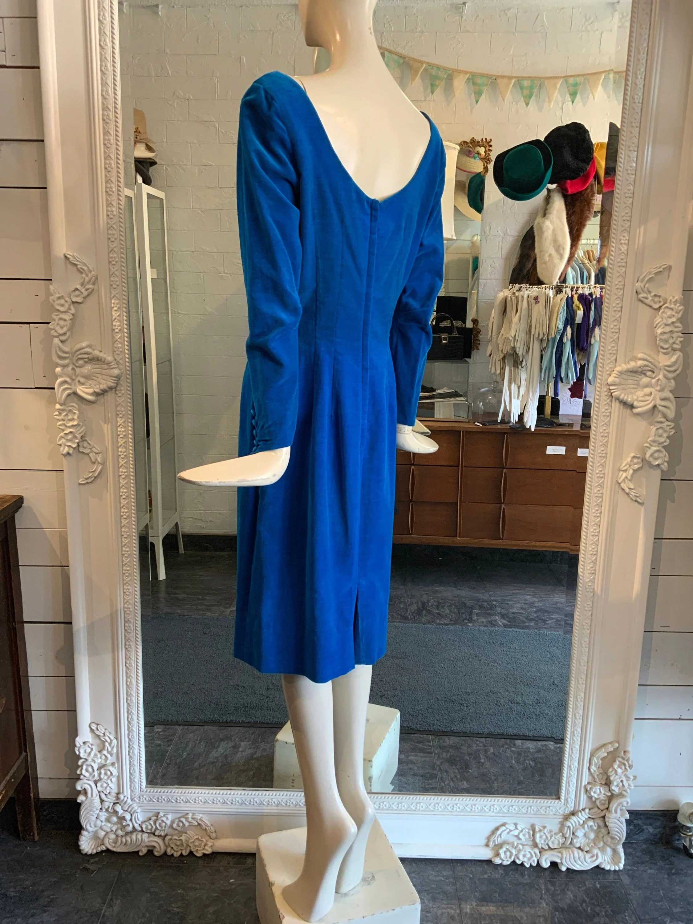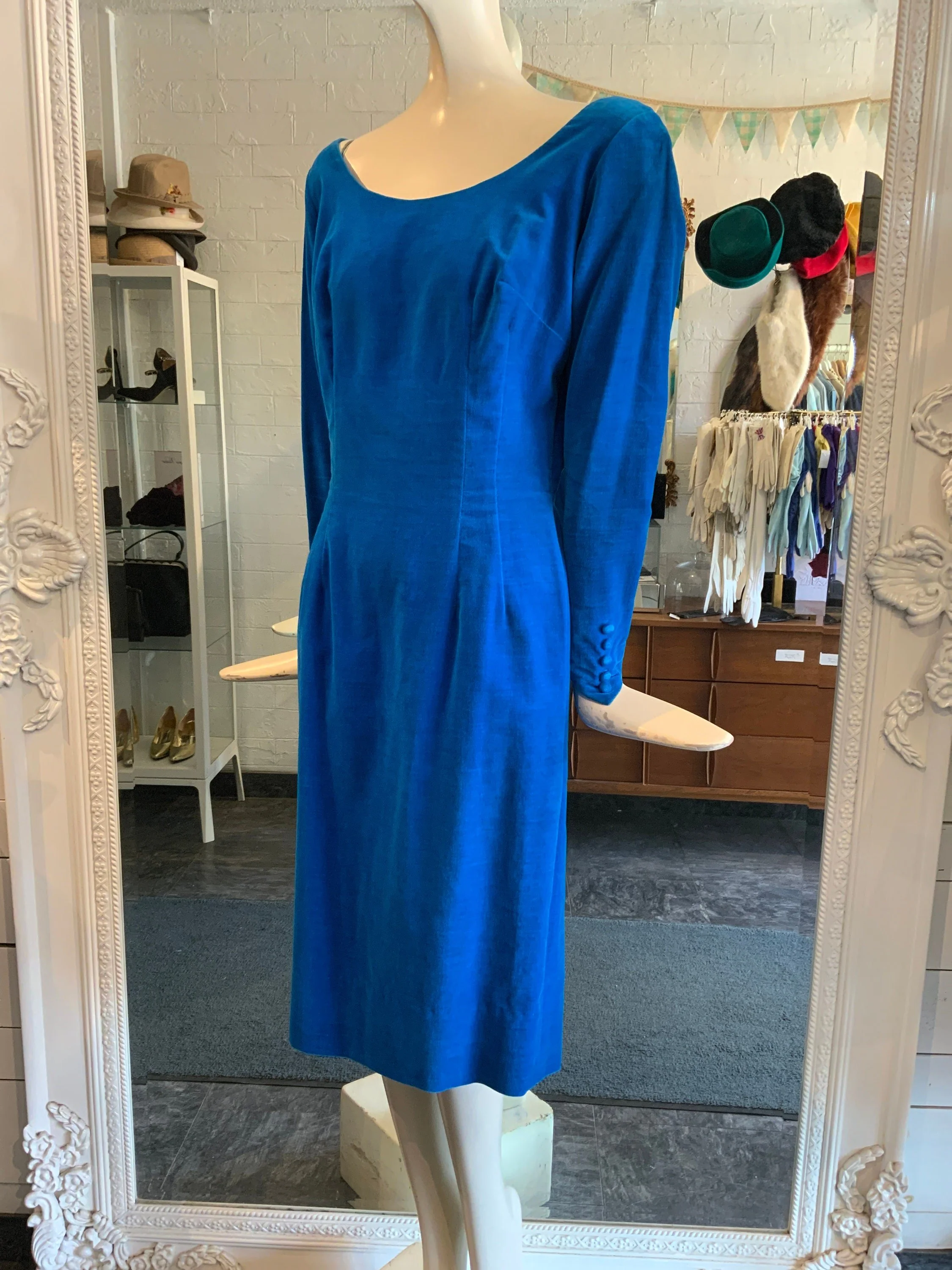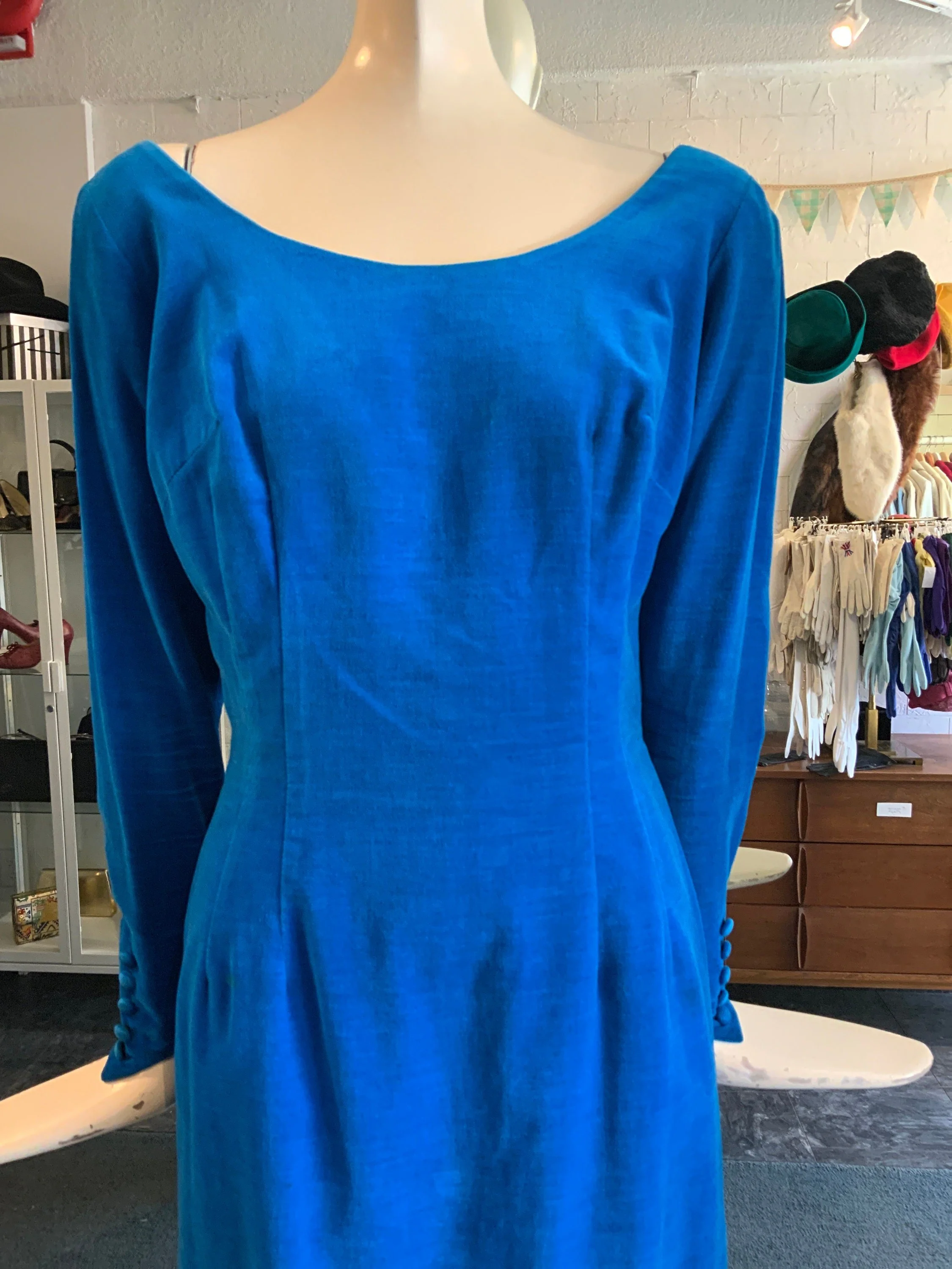 1960s blue and green floral cocktail dress. This has such a pretty pattern that features oversized flowers. It is a shift dress and comes with a thin fabric belt; you can wear it with or without the belt depending on your preference. The neckline shows off your shoulders and is very demure. We love the bow over the left shoulder!