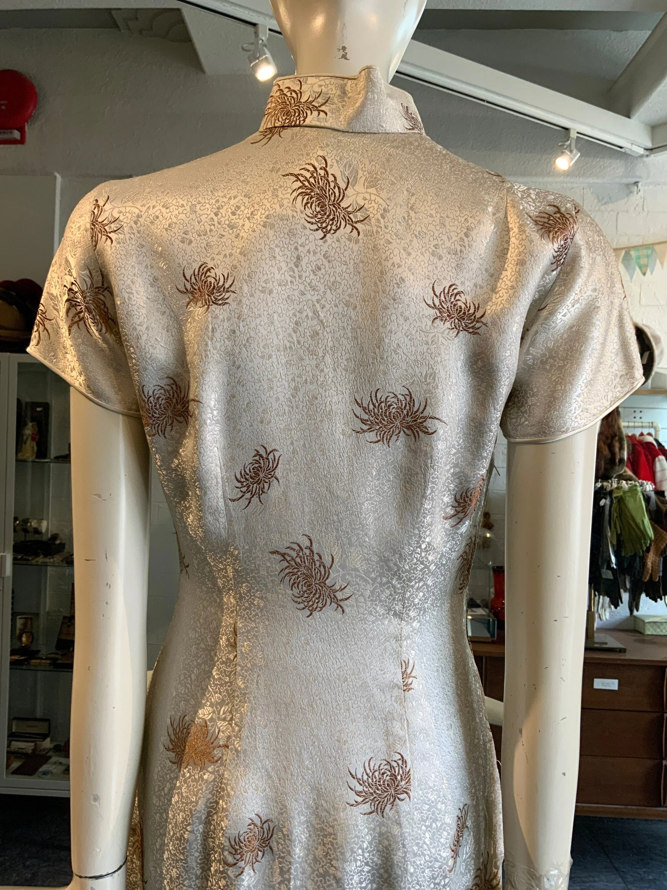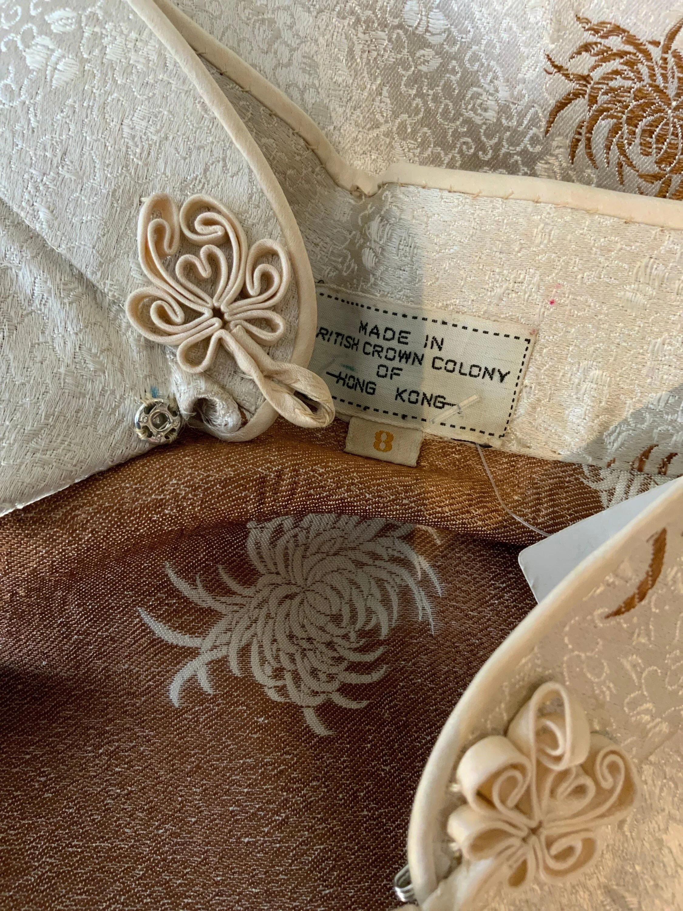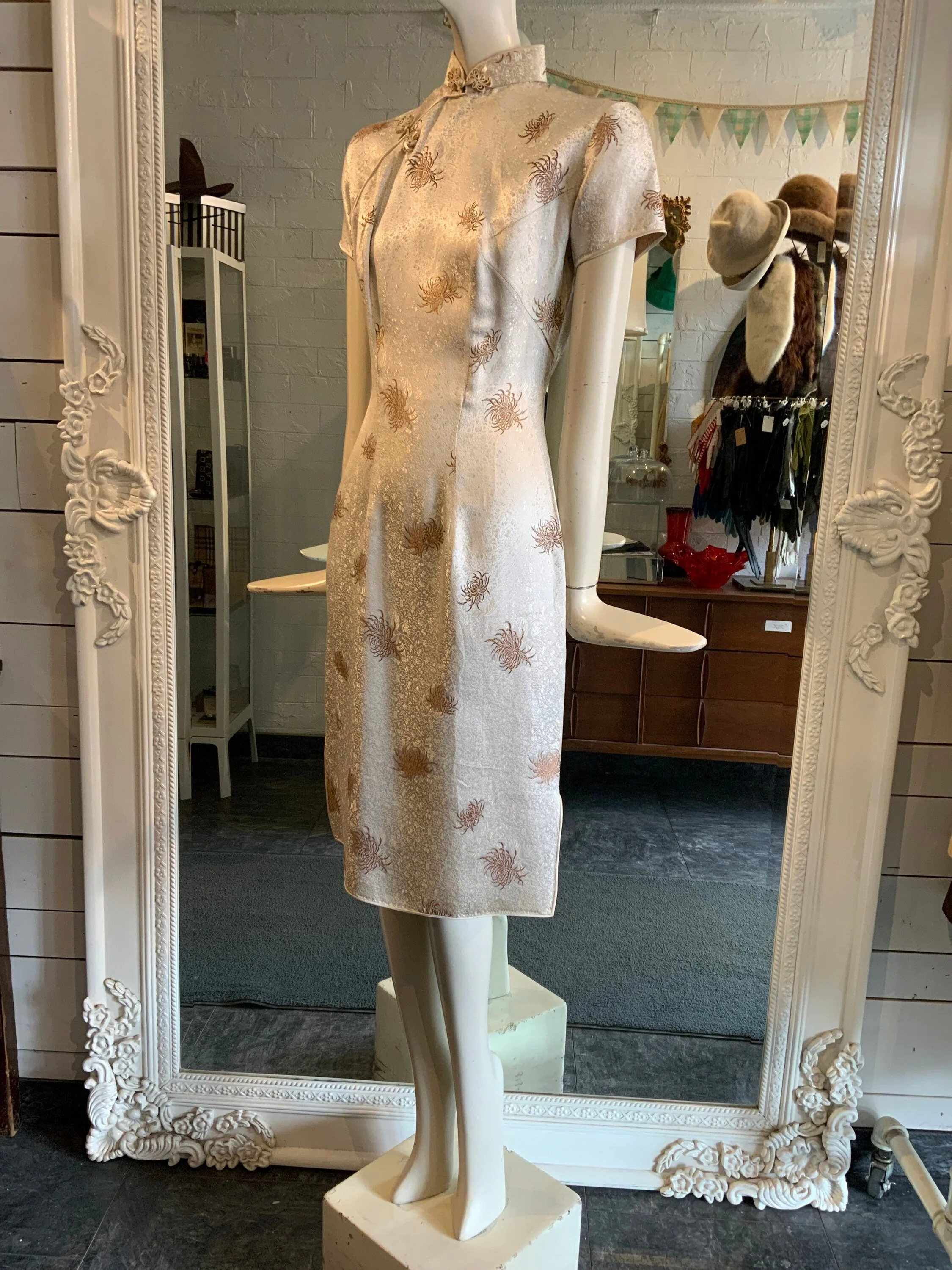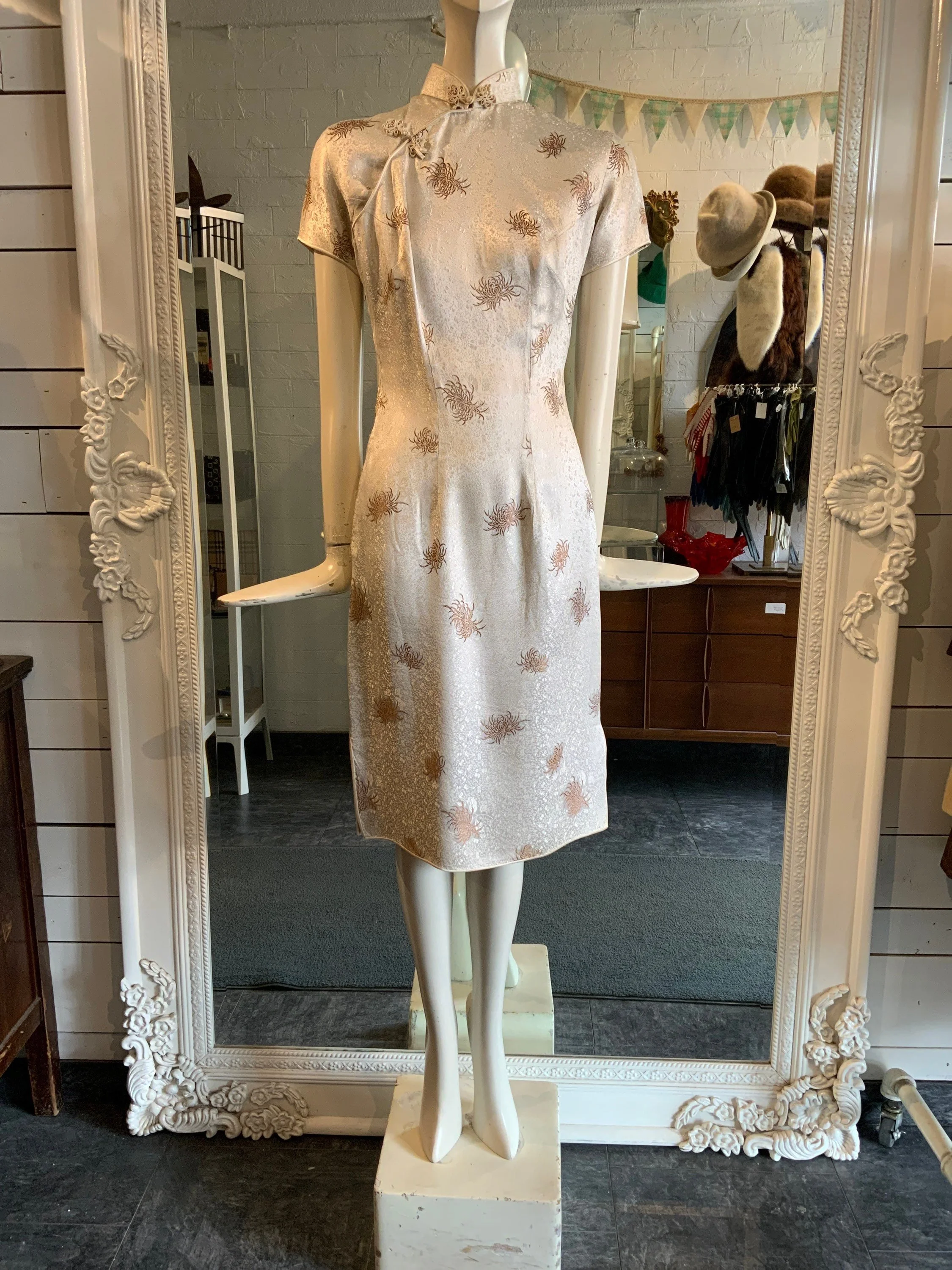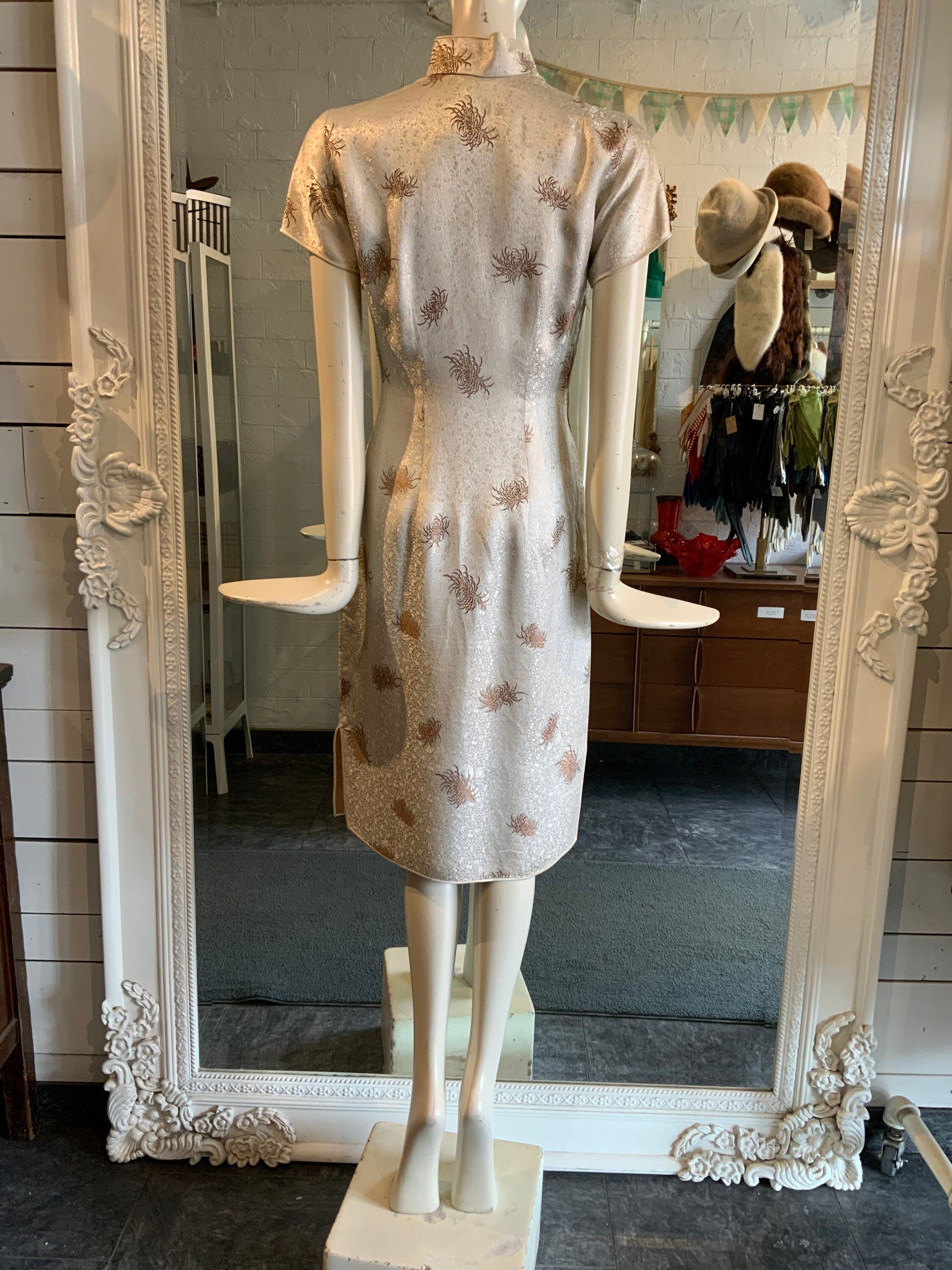 Y2K bias cut Carrie Bradshaw silk dress in a fabulous tropical print, complete with sequin details. The print features tropical birds and foliage in warm browns, greens, and oranges. This stunning on - great for weddings, news years eve, grad, or just grabbing cocktails!