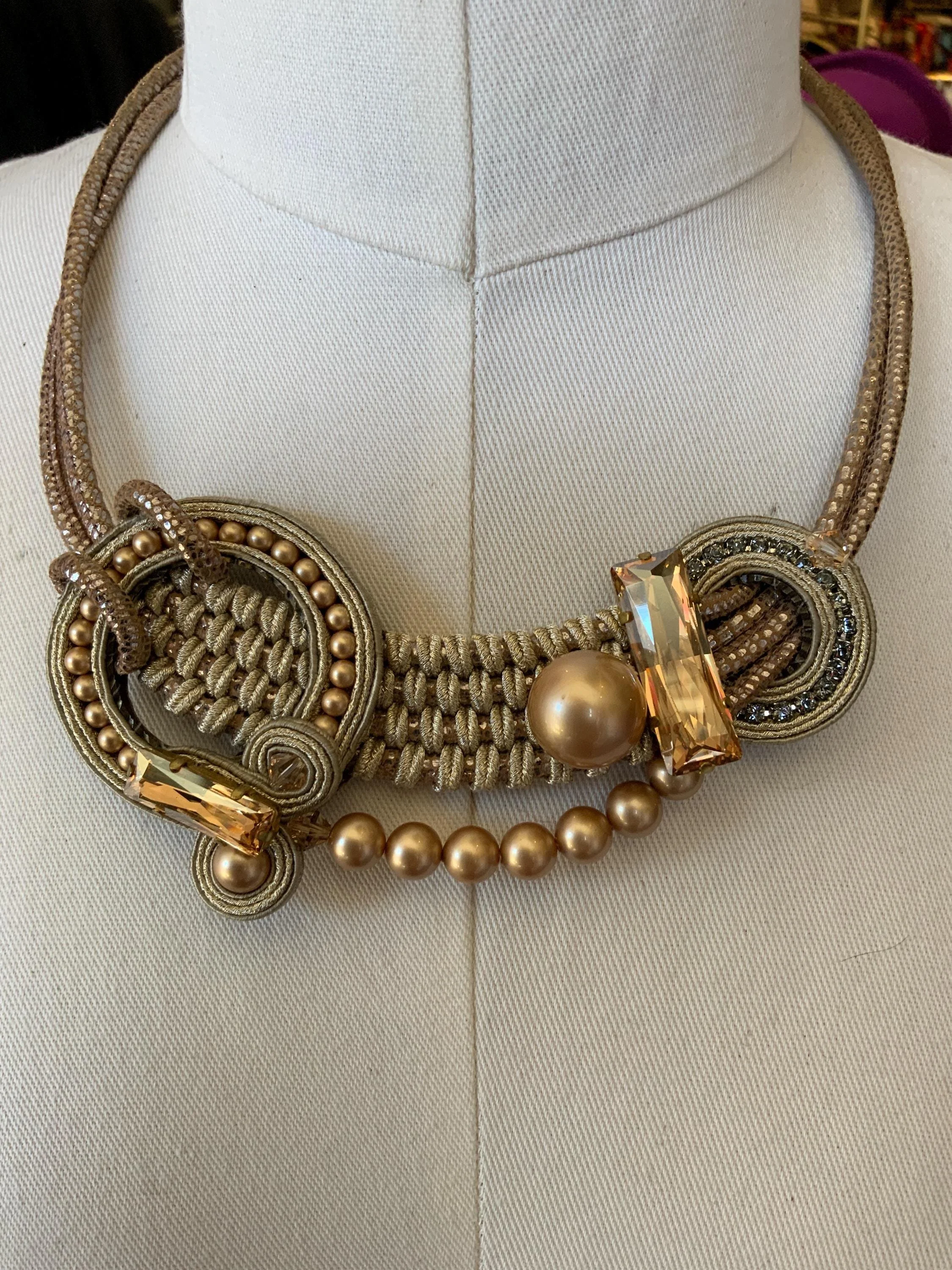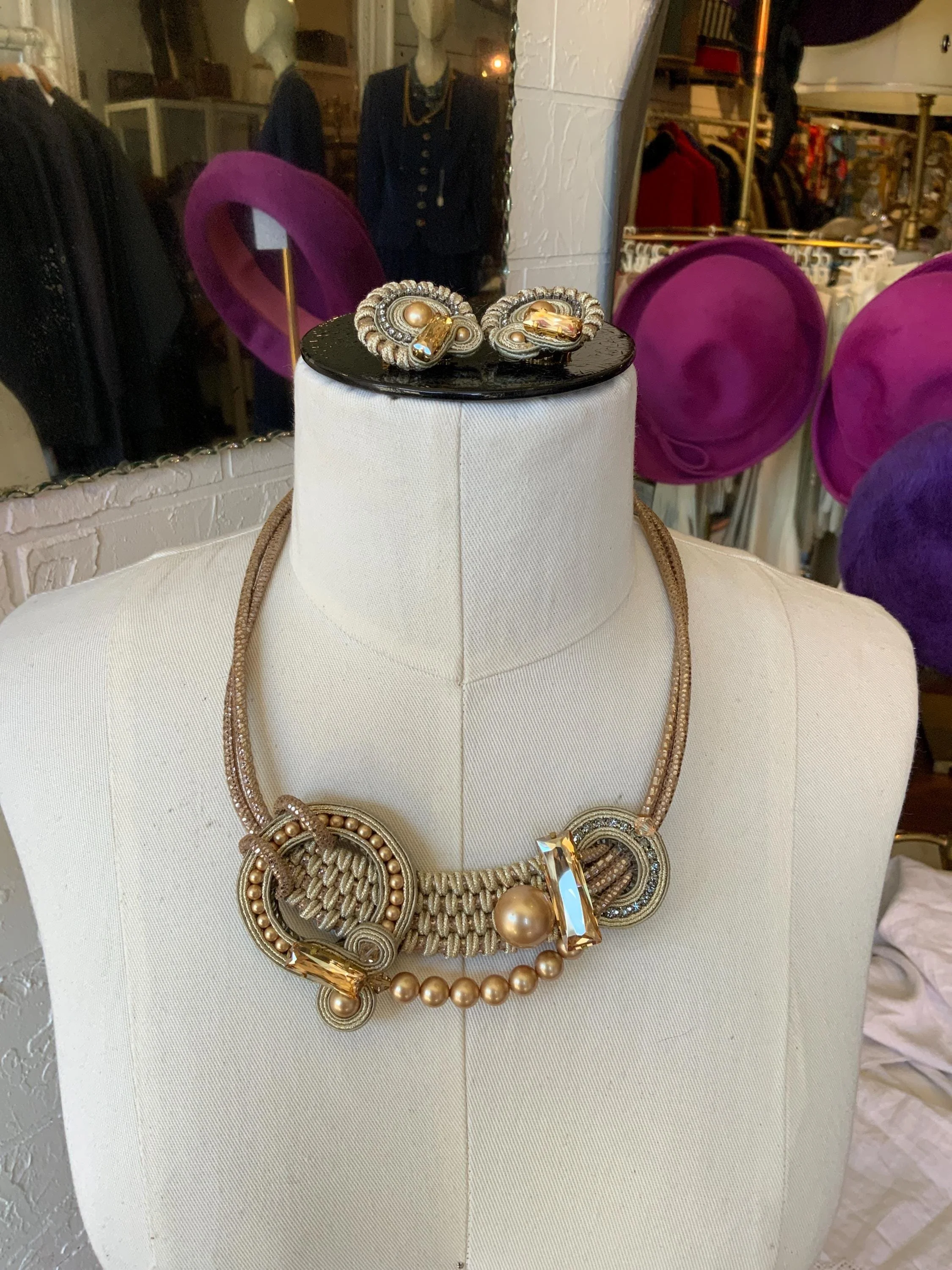 Fabulous and unique rhinestone necklace. This is a stand out piece - wear it when you’re feeling an extra sassy or need a little boost. Square inset stones make up the “chain” portion of the necklace and sizes and shapes create the unique pendant portion ( it’s all one piece though). While some of the stone have turned a bit dark, this necklace still stuns and sparkles beautifully.